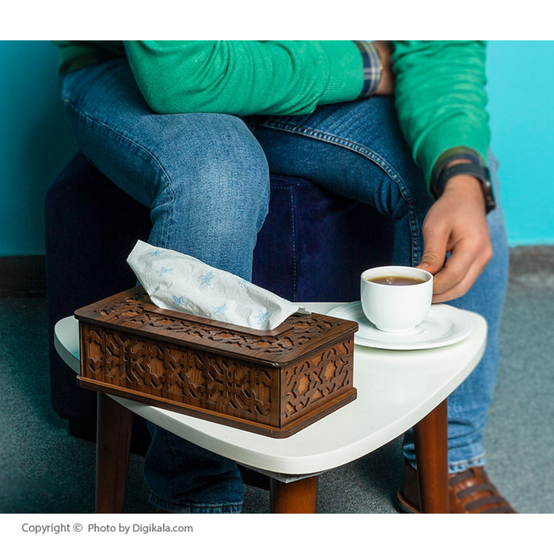 جعبه دستمال کاغذی هُم آدیس مدل نگین کد BF 012-G برای نگهداری دستمال کاغذی طراحی شده است و به لطف آن دستمال کاغذی شما در یک جعبهی زیبا و شکیل روی میز قرار میگیرد. این جعبه ساختاری از جنس ام دی اف دارد و به خوبی میتوانید آن را با دیگر محصولات دکوری و چوبی ست کنید. شرکت تولیدکنندهی این محصول برای بالا بردن مقاومت آن در برابر رطوبت و خوردگی بر خلاف محصولات مشابه بازار که از یک لایه 3 میل MDF روکش کاغذ استفاده می کنند از 2 لایه MDF با روکش ملامینه بهره برده است که در عکسها هم بوضوح مشخص است. از دیگر مزایای این جعبه دستمال کاغذی میتوان به طراحی زیبای آن اشاره کرد که با هنر معرق مزین شده است و جلوه خاصی به آن داده است. این جعبه دستمال کاغذی ابعادی برابر 8 × 14 ×25 سانتیمتر داشته و وزن آن 420 گرم است. درب این جعبه به شکل کشویی از بخش پایینی باز میشود و میتوانید داخل آن دستمال کاغذی قرار دهید. اگر به دنبال مجموعه ی جعبه دستمال کاغذی و سطل هستید می توانید سطل ست با این جعبه که با کد BF 013-G در فروشگاه دیجی کالا موجود است را هم تهیه نمایید.